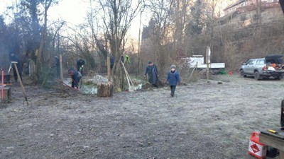 Les iris qui envahissaient tout ont été retirés, quelques arbres tombés ont été tronçonnés, l'espace abri a été ouvert pour faire plus de place pour notre coin feu, nous avons mis en place 4 piquets et des cordes pour faire deux barrières.