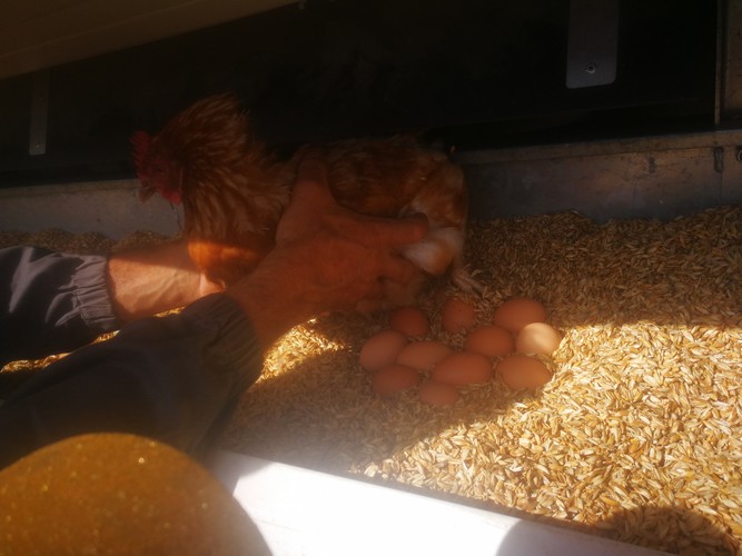 Après, nous sommes allés voir les Coquettes … enfin les Poulettes ! La particularité de ces poules, c’est qu’elles produisent des œufs tout un profitant d’un abri mobile. Régulièrement, Daniel et Suzanne déplacent les deux abris mobiles pour leur permettre de retrouver un meilleur sol. Dans cet enclos, tout est prévu : nourriture, couveuse, protection contre les renards et abri. Nous avons pu rentrer dans le poulailler, observer les couveuses et récolter des œufs.